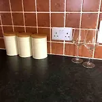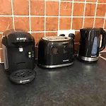 Naast koffie- en theevoorzieningen is dit appartement uitgerust met een complete keuken met een koelkast en een oven.